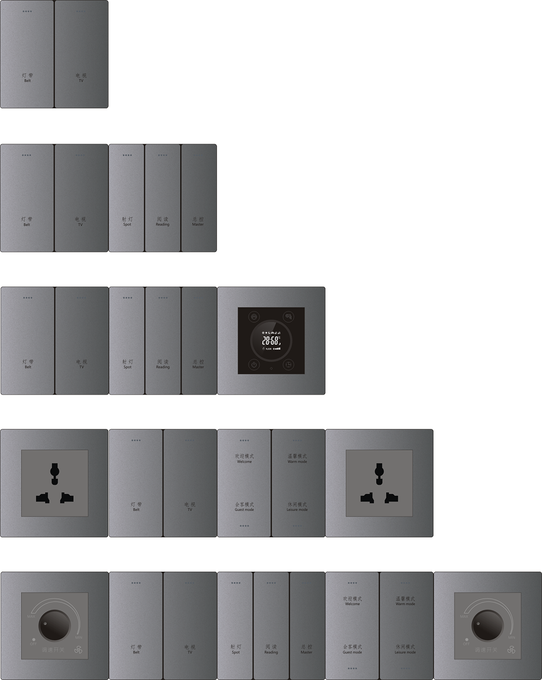 灯光、总关、调光、窗帘、窗纱、勿扰、清理、 情景模式等
